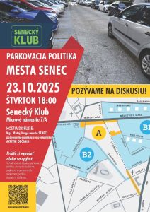 PRÍĎTE SA POROZPRÁVAŤ O PARKOVACEJ POLITIKE MESTA SENEC so zastúpením mesta a aktívnymi občanmi. hostia: Matej Varga – komunikácie a parkoviská SC Peter Kmeť – komisia dopravy a parkovania Vstup voľný.